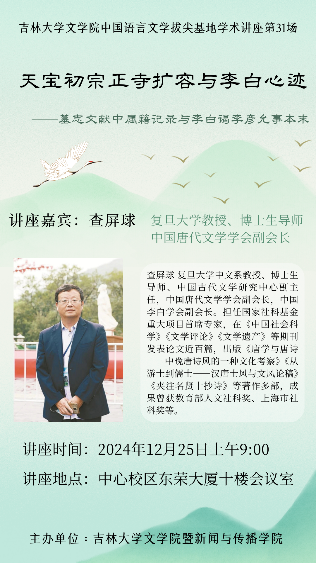 查屏球 复旦大学中文系教授、博士生导师、中国古代文学研究中心副主任,中国唐代文学学会副会长,中国李白学会副会长。担任国家社科基金重大项目首席专家,在《中国社会科学》《文学评论》《文学遗产》等期刊发表论文近百篇,出版《唐学与唐诗——中晚唐诗风的一种文化考察》《从游士到儒士——汉唐士风与文风论稿》《夹注名贤十抄诗》等著作多部,成果曾获教育部人文社科奖、上海市社科奖等。