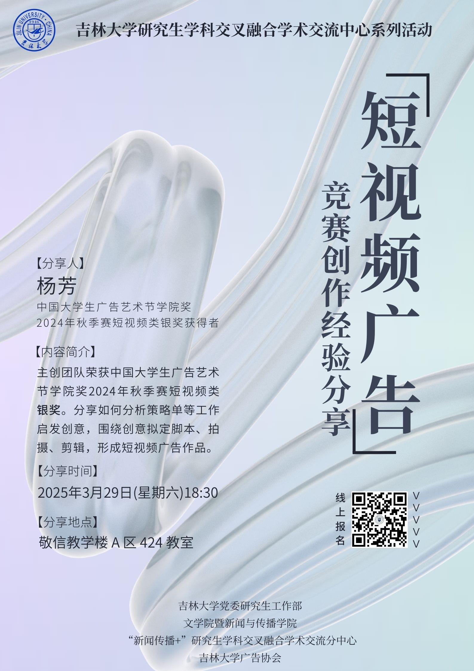 为推动高水平学科竞赛与实践教学的深度融合,提升我校学生创意思维与专业能力素养,着力培养更多具有创新精神和实干本领的新时代复合型传媒人才。拟于近期开展短视频广告竞赛作品创作经验分享会,具体通知内容如下: