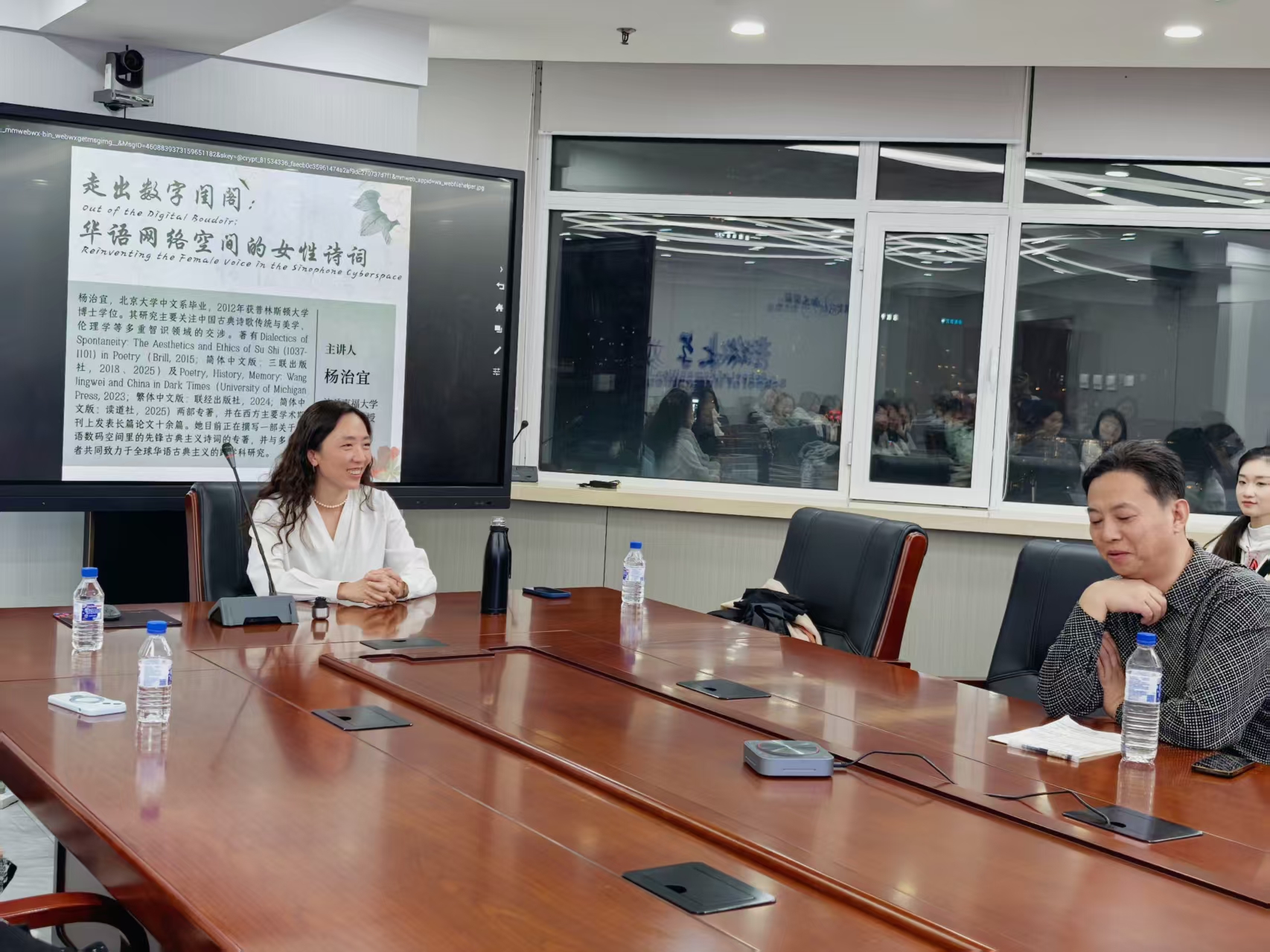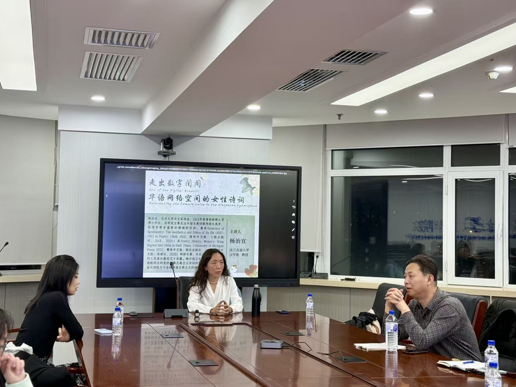 2025年10月28日晚,球探网页版讲座在东荣十楼会议室举行。本次讲座由杨治宜教授主讲,讲座主题为《走出数字闺阁:华语网络空间的女性诗词》,球探网页版马大勇教授与谈,副教授赵郁飞主持,数十位校内师生参与。