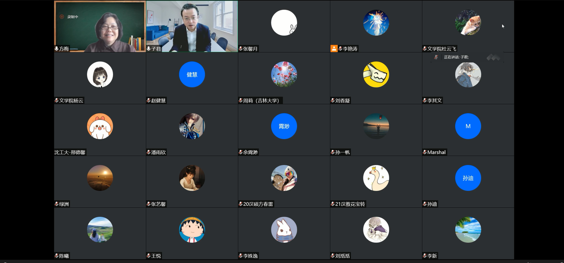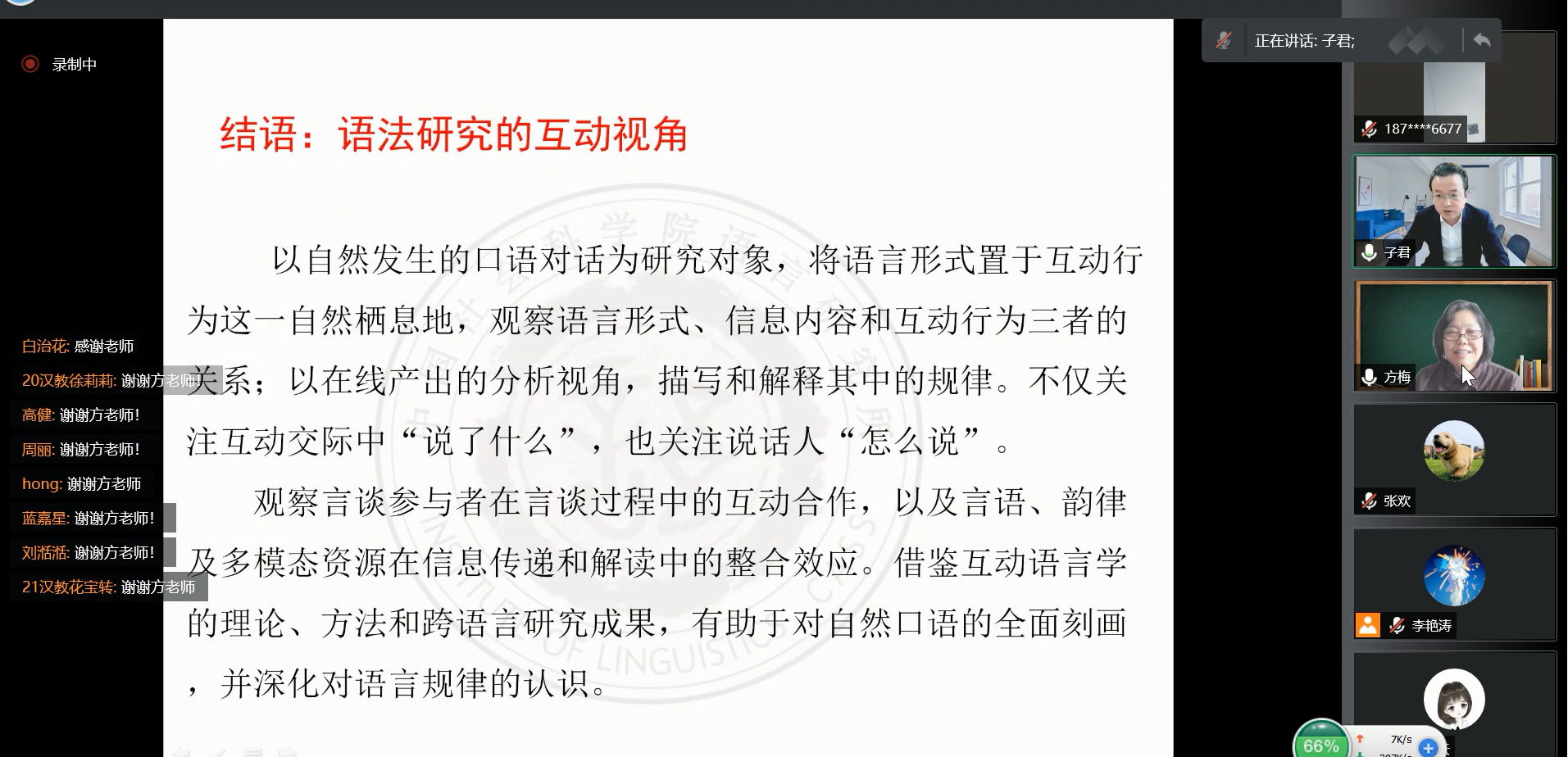 2022年5月11日上午九点,中国社会科学院语言研究所研究员、教授、博士生导师,《中国语文》副主编、中国语言学会副会长方梅教授于腾讯会议线上为我校师生带来名为“语法研究的互动视角”的专题学术讲座。讲座由球探qiutan(中国)语言学教研室李子君教授主持,徐正考教授、柳英绿教授、吕明臣教授、岳辉教授、刘艳茹教授等教师以及诸多学子都参加了此次线上讲座。此次讲座是吉林大学哲学社会科学名家讲座第1117场。