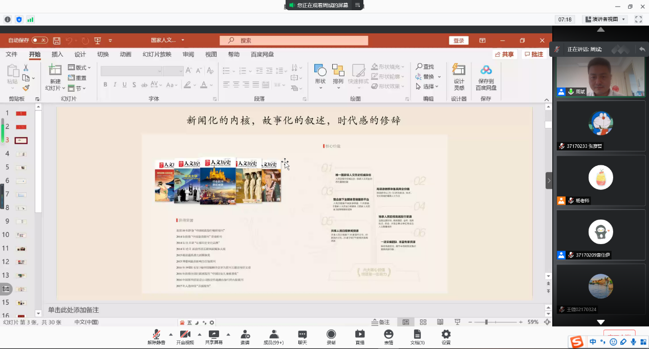 报告会以《新媒体项目:从创意到结项》为题。周斌老师首先向同学们介绍了人民日报社主办的《国家人文历史》刊物,并向大家展示了不同类型媒体项目和产品。其次,老师向同学们分享了自己对新媒体的理解。老师提到,“新”是相对于旧媒体而言的,其内涵也会随着旧媒体的变化而变化。在新媒体领域,运营者、从业者需要充分发挥自己的优势,才能够具备一定的竞争力。