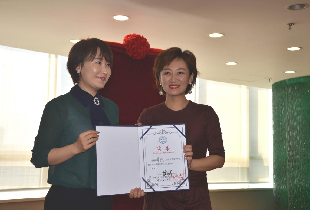 图4:吉大新闻与传播学院广电系副主任张芳馨向吉大校友、南昌广播电视台团委书记、首席播音员梁爽(右)颁发球探qiutan(中国)及新闻传播学院社会实践导师聘书。