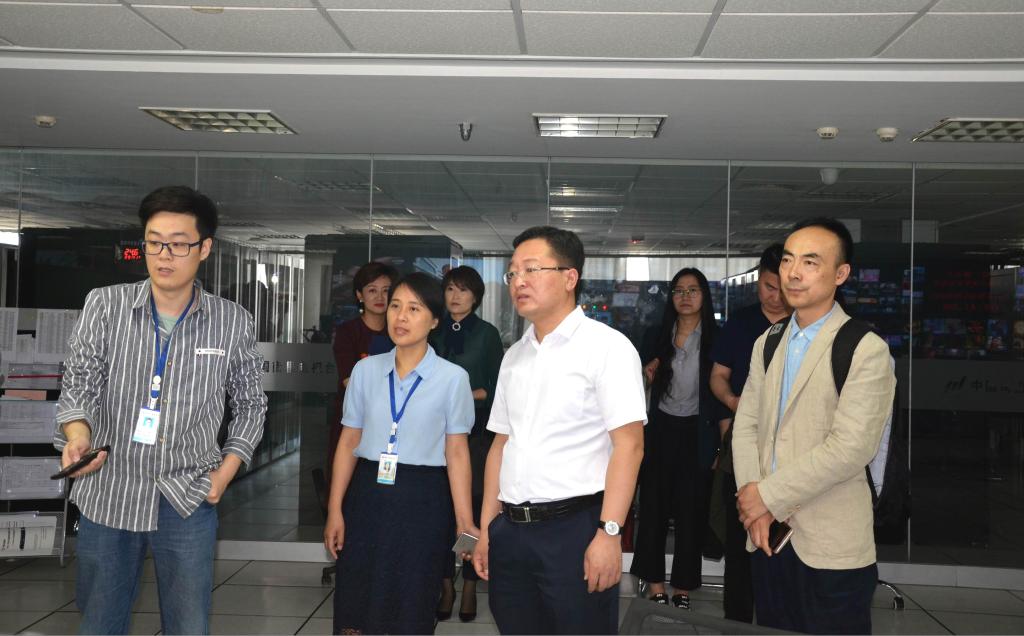 图6:康永刚书记一行在南昌广播电视台副台长许海霞(左二)陪同下参观南昌广播电视台南广网络总前端播出机房,详细了解华数云平台4K播出系统。