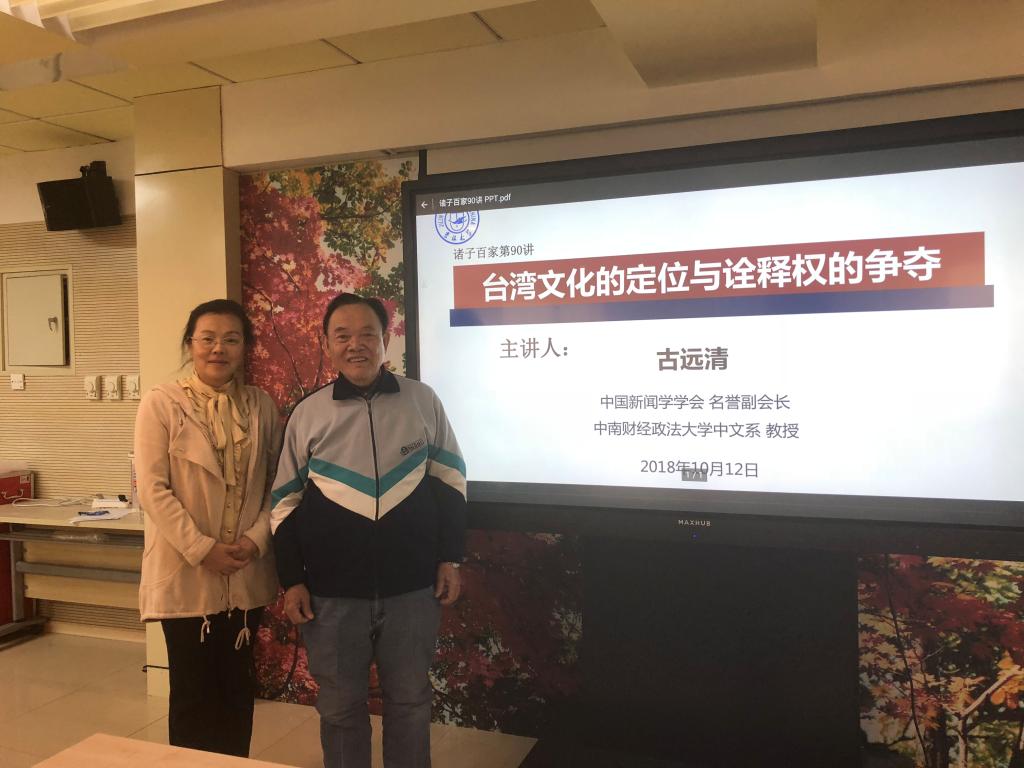 10月12日下午,“诸子百家”系列讲座第九十讲在东荣十楼会议室成功举办。本次讲座的主讲人是中国新文学学会名誉副会长,中南财经政法大学中文系教授古远清先生,主持人由球探网页版教授白杨老师担任。讲座以《台湾文化定位与诠释权的争夺》为主题,受到师生的热烈欢迎。