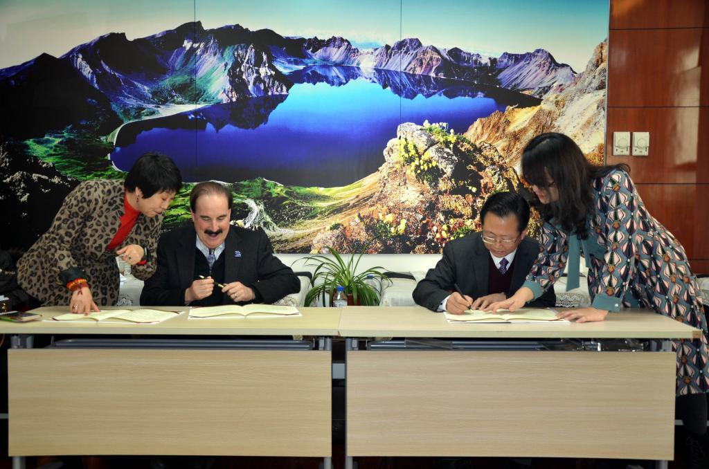 图2:马克院长(左二)与徐正考院长(右二)签署肯塔基大学文理学院与球探网页版合作意向书。