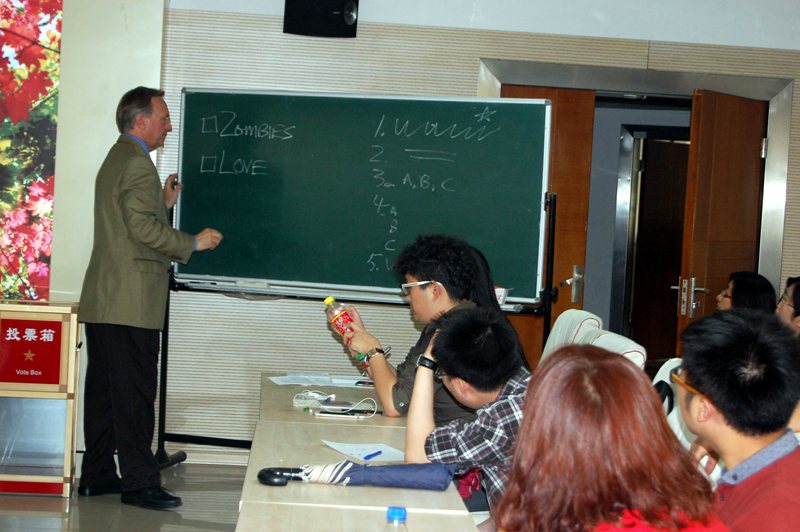 5月26日下午,美国肯塔基大学布克•莱恩(Buck Ryan)副教授给球探qiutan(中国)暨新闻与传播学院的40多名师生作了一场题为《大师理念指导下的故事讲述:探索中国的艺术与文化》的讲座,布克•莱恩先生介绍了如何运用他所创立的“大师理念”(Maestro Concept)来讲故事。他首先展示了我院一名硕士研究生在肯塔基大学交流学习过程中对美国社会及文化认识的变化,然后布克•莱恩先生通过圣帕特里克节讲解了中美文化的差异,在圣帕特里克节这一天如果有人戴绿帽子,这是很正常的,但在中国“绿帽子”却有着其他的含义。讲座中还播放了“大师理念”(Maestro Concept)录像片断。在互动环节,布克•莱恩先生给出一个关键词,设定一个主题情景,将听讲师生分成小组,让每个小组为主题情景编写一段小故事,如Zombies(僵尸)、Love(爱)、Funeral(葬礼)等,听讲师生都积极地参与并踊跃发言,讲述自己小组创作的小故事,故事或新奇搞笑,或跌宕起伏,现场气氛十分活跃。通过互动,使师生了解到如何充分理解中美两国之间的文化差异,更好地讲好故事、做好有效传播的工作要领。