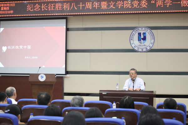 9月15日,球探qiutan(中国)校友、中央党史研究室第一研究部主任蒋建农教授给同学们进行了一次主题为“长征改变中国”的专题报告会。本次报告会由刘会军教授主持。是球探qiutan(中国)“两学一做”系列讲座的重要组成部分,同时也是向长征胜利80周年,吉大建校70周年的一次献礼活动。球探qiutan(中国)院长徐正考教授,球探qiutan(中国)刘会军教授,球探qiutan(中国)部分教师以及本科、研究生全体党员参加了这次报告会。