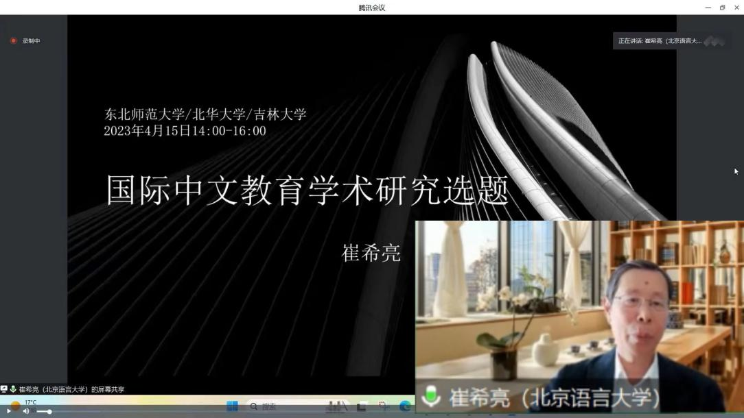 4月15日下午,我院联动东北师范大学国际汉学院、北华大学国际教育交流学院,邀请北京语言大学语言学与应用语言学教授、中国书法国际传播研究院院长、世界汉语教学学会副会长、北京语言大学原校长崔希亮教授,做了题为“国际中文教育学术研究选题”的线上讲座。崔教授的研究视野广阔,兼具高度与深度,不仅关注语言理论,同时也关注语言教育,尤其在国际中文教育领域具有独到的见解。讲座从国际中文教育所面临的现实问题出发,梳理了基础研究和应用研究发展的阶段历程与重要意义;详细阐述了宏观、中观、微观三个层次的研究内容与研究方法,并提供了切实可行的示例,如:宏观层面的国际中文教育发展策略研究、中观层面的国际中文教育学科建设研究、微观层面的课堂教学研究等。崔教授的讲座高屋建瓴、深入浅出,开阔了学院师生的学术研究视野,拓宽了科研新思路,与会师生均表示受益良多。