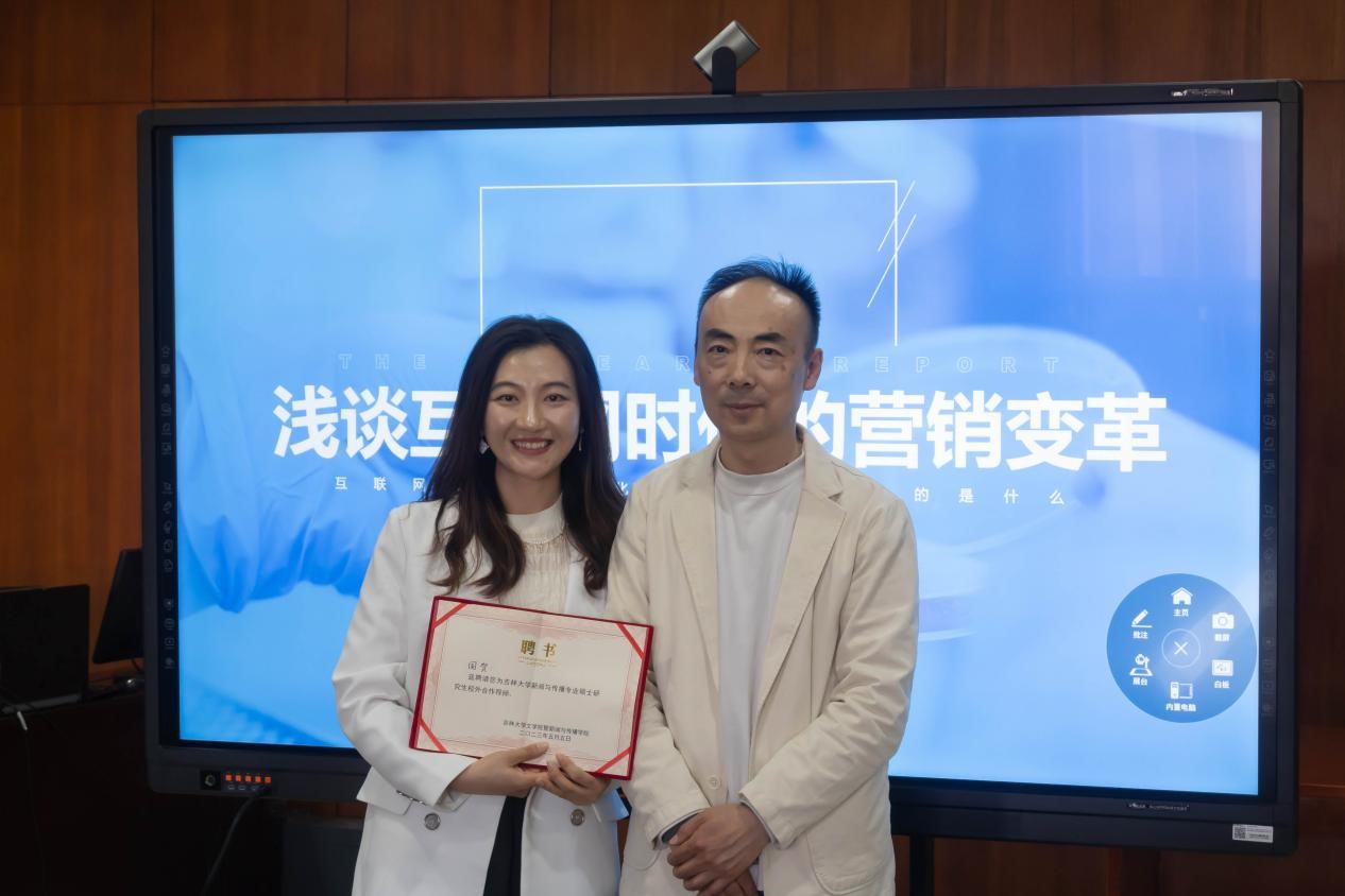在国贺老师与现场师生结束互动后,鞠惠冰教授为她颁发吉林大学新闻与传播专业学位硕士产教融合培养实践基地的校外合作导师聘书。现场气氛热烈,活动在持续的掌声中落下帷幕。