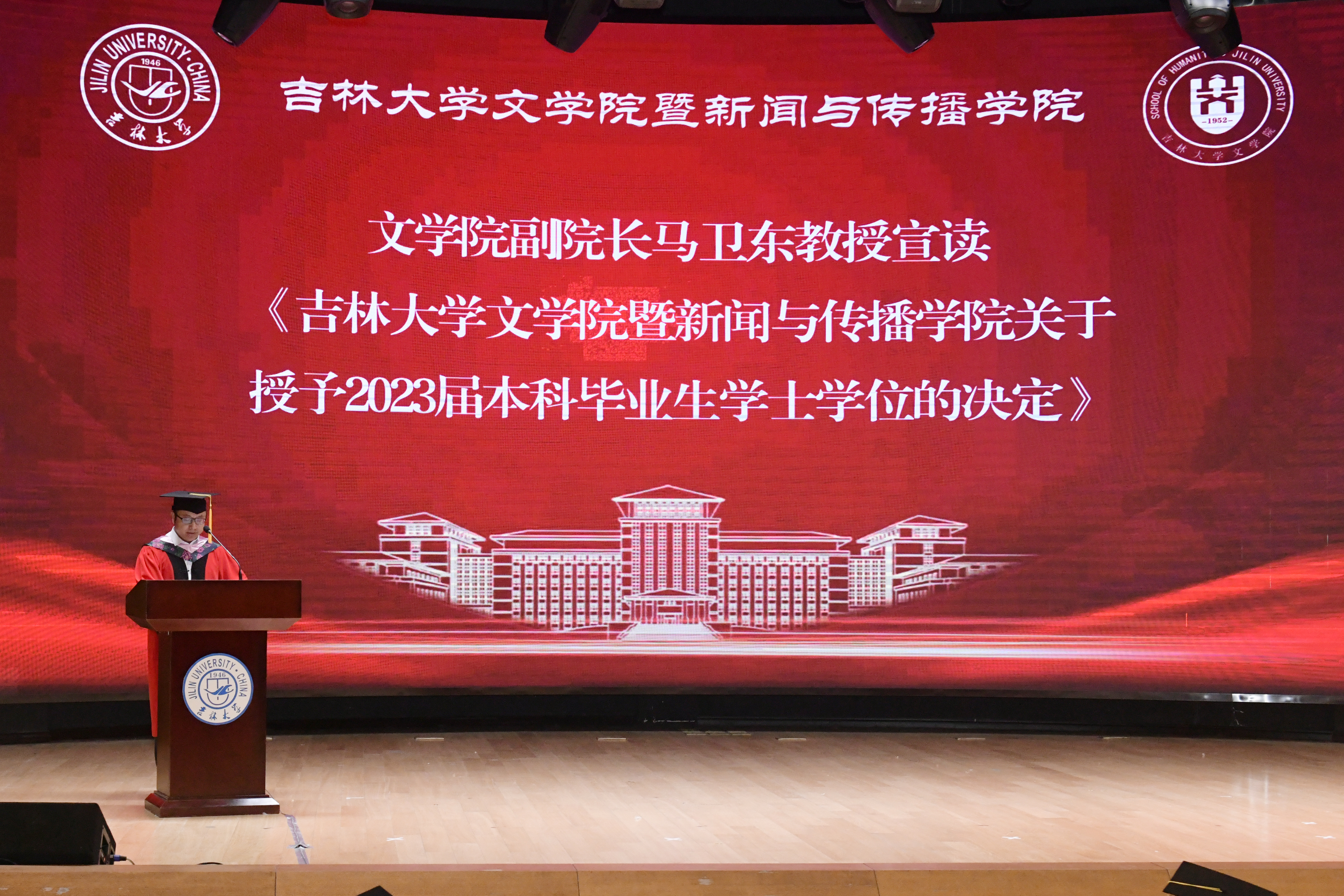 然后,副院长孔朝蓬教授宣读了《球探网页版暨新闻与传播学院关于授予2023届毕业研究生博士学位、硕士学位的决定》,吉林大学哲学社会科学资深教授张福贵、院长张丛皞为获得博士学位的同学一一授予了学位。随后,七位主礼教授移步台上共同为获得硕士学位的学生授予学位。