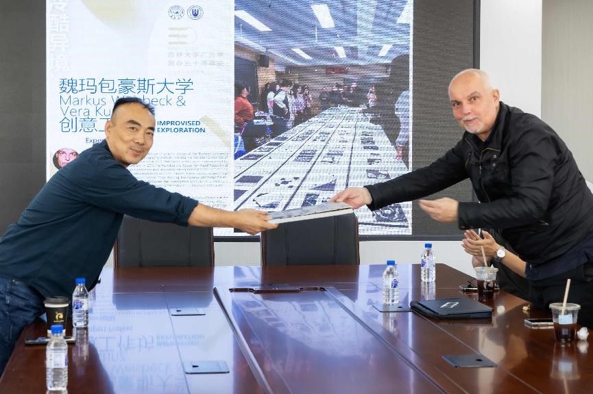 在座谈的最后,Markus Weisbeck教授向广告学专业赠送了个人教学案例丛书,书中详细介绍了他在教学过程中的经历、创意以及独特的教学方式方法。鞠惠冰教授也将吉大文创产品作为礼物回赠给Markus Weisbeck教授。