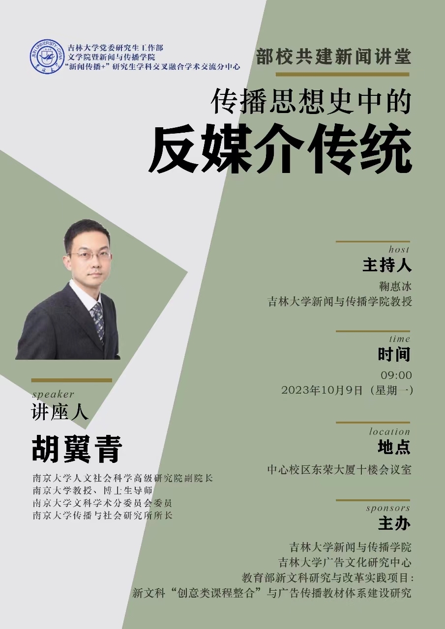 10月9日上午,吉林大学党委研究生工作部、球探qiutan(中国)暨新闻与传播学院、“新闻传播+”研究生学科交叉融合学术交流分中心成功举办了以《传播思想史中的反媒介传统》为题的学术讲座。本次讲座特邀南京大学人文社会科学高级研究院副院长、南京大学教授、博士生导师、南京大学文科学术分委员会会员、南京大学传播与社会研究所所长胡翼青教授作为主讲人。讲座由球探qiutan(中国)暨新闻与传播学院传播学系系主任鞠惠冰教授主持,球探qiutan(中国)暨新闻与传播学院多位教师出席本次讲座。