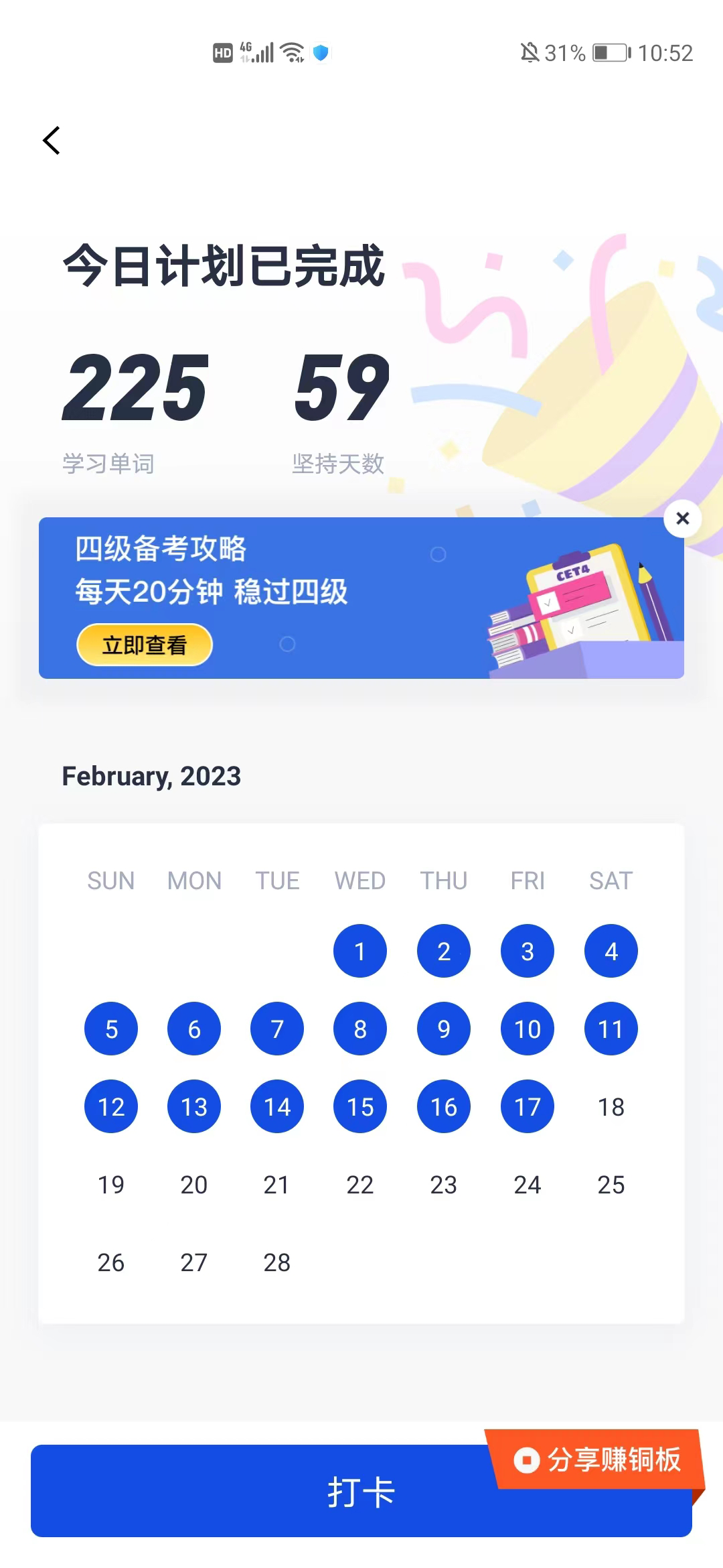 2023年1月28日至2023年2月17日,球探网页版暨新闻与传播学院学生会学术部组织开展了“兔”飞猛进,笃行致远——文传学院21天自律学习打卡活动。吉林大学全体同学积极参与,来自各个学院的227位同学参与到学习打卡活动当中。活动取得了良好的成果,于2023年2月17日圆满落幕。
