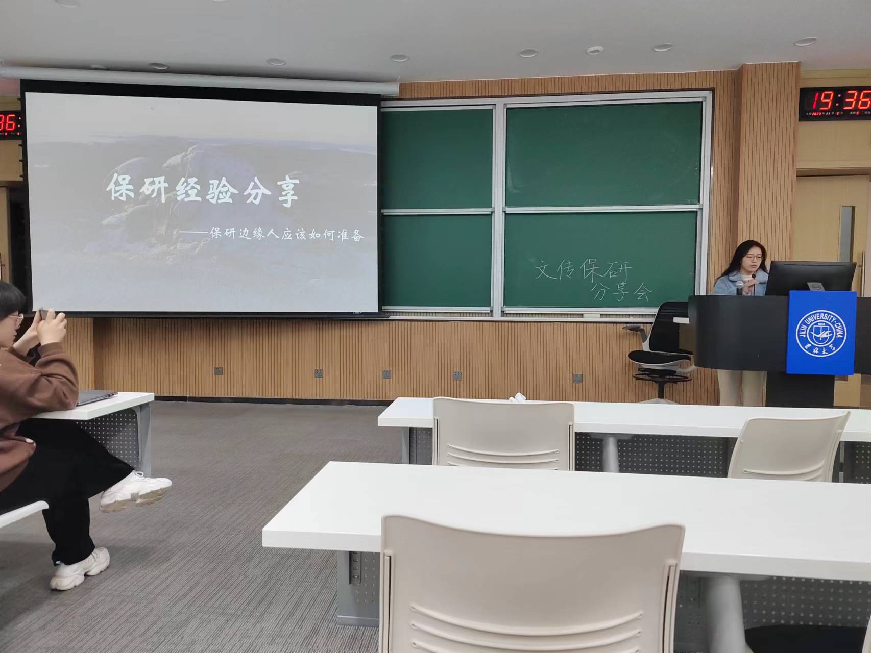 分享会伊始,黄宝申系统介绍了行政保研的具体内涵、基本条件、成绩和排名要求,为同学们提供不同的保研思路。方振涛则围绕“夏令营+预推免”的保研经历,帮助同学们明确了保研的基本要求、重要时间线、网上申报需要准备的材料与相关事宜。宋其芳从“抓住资格,具象目标,规划时间,实战检验”这四个方面进行分享,分析高校关注点和核心竞争点,为同学们提出努力方向的建议。李姝逸主要就对外汉语教学方向系统介绍了不同院校考察特点及录取情况,以及需要做的准备。张怡茹介绍了出国方向的保研信息,提示同学们审慎考虑学校与深造专业方向选择,最后梳理了一些针对保研面试的注意事项。潘雨欣强调要把主要精力放在专业课的学习上,积累专业知识,提升个人专业素养。韩雪芳就择校与择专业,夏令营与预推免等保研事项展开具体介绍,提示同学们要结合个人实际情况进行衡量取舍。