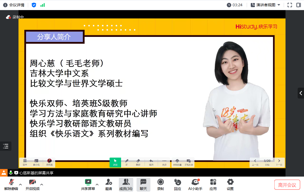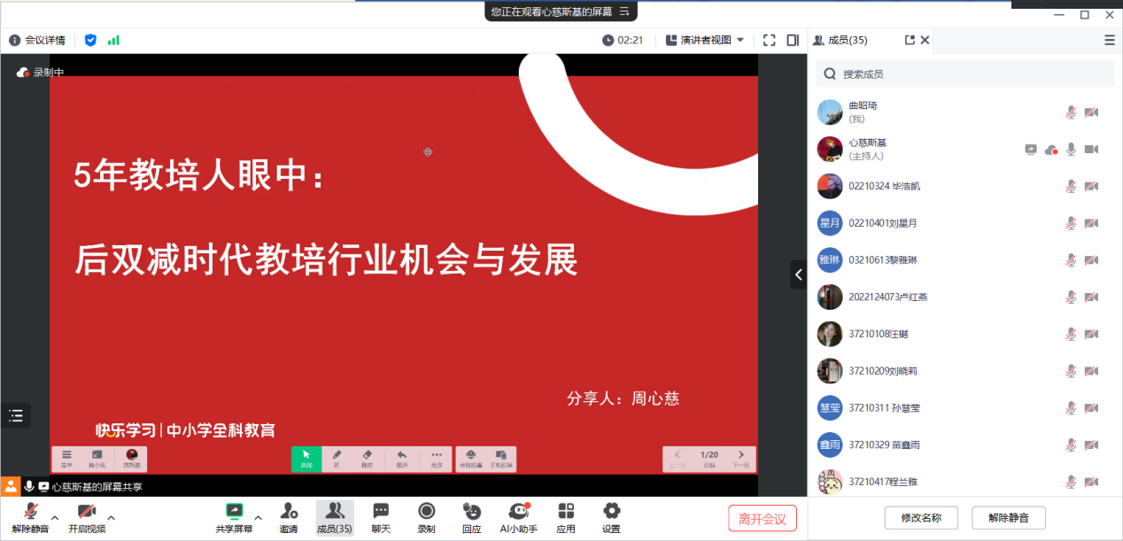 5月23日下午3时,“就”在文传系列实践报告会第二十九场《五年教培人眼中:后双减时代教培行业机会与发展》于腾讯会议上顺利召开。此次活动特邀快乐学习教育科技集团语文教研员、学习方法与家庭教育研究中心讲师,我院优秀校友周心慈担任主讲嘉宾,为同学们了解教培机构以及求职、校招等问题提供了宝贵机会,2020级辅导员李芊满参会,兼职辅导员曲昭琦主持会议。