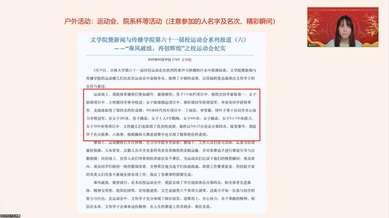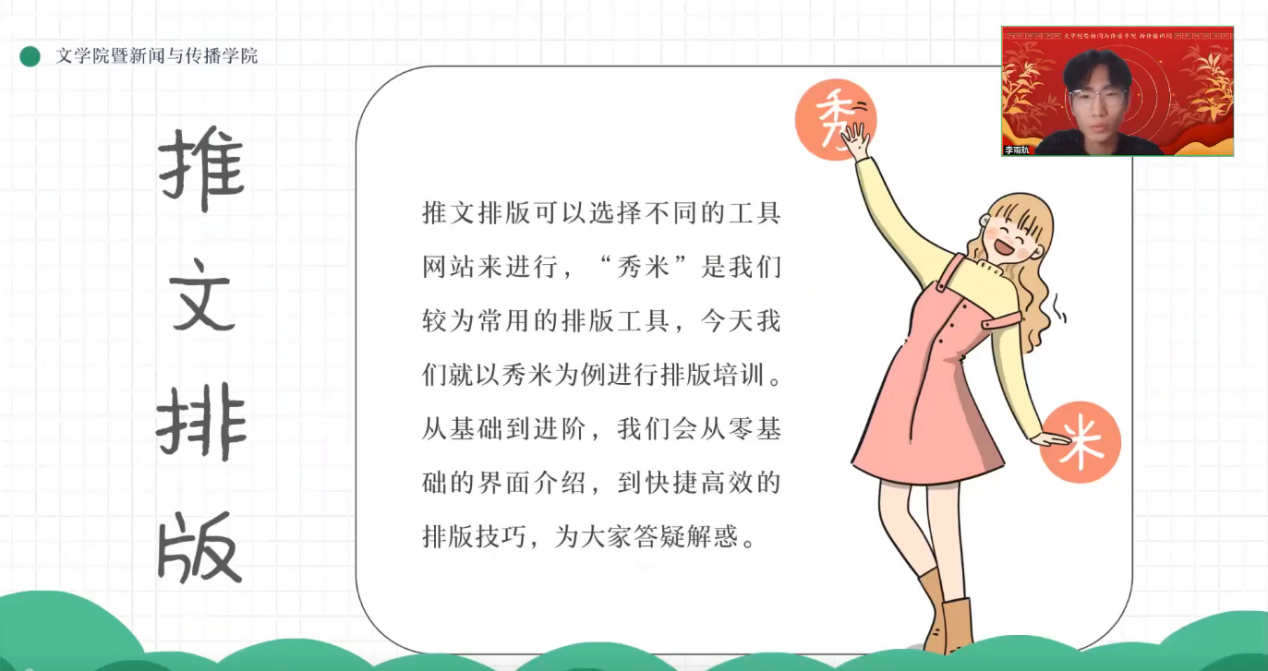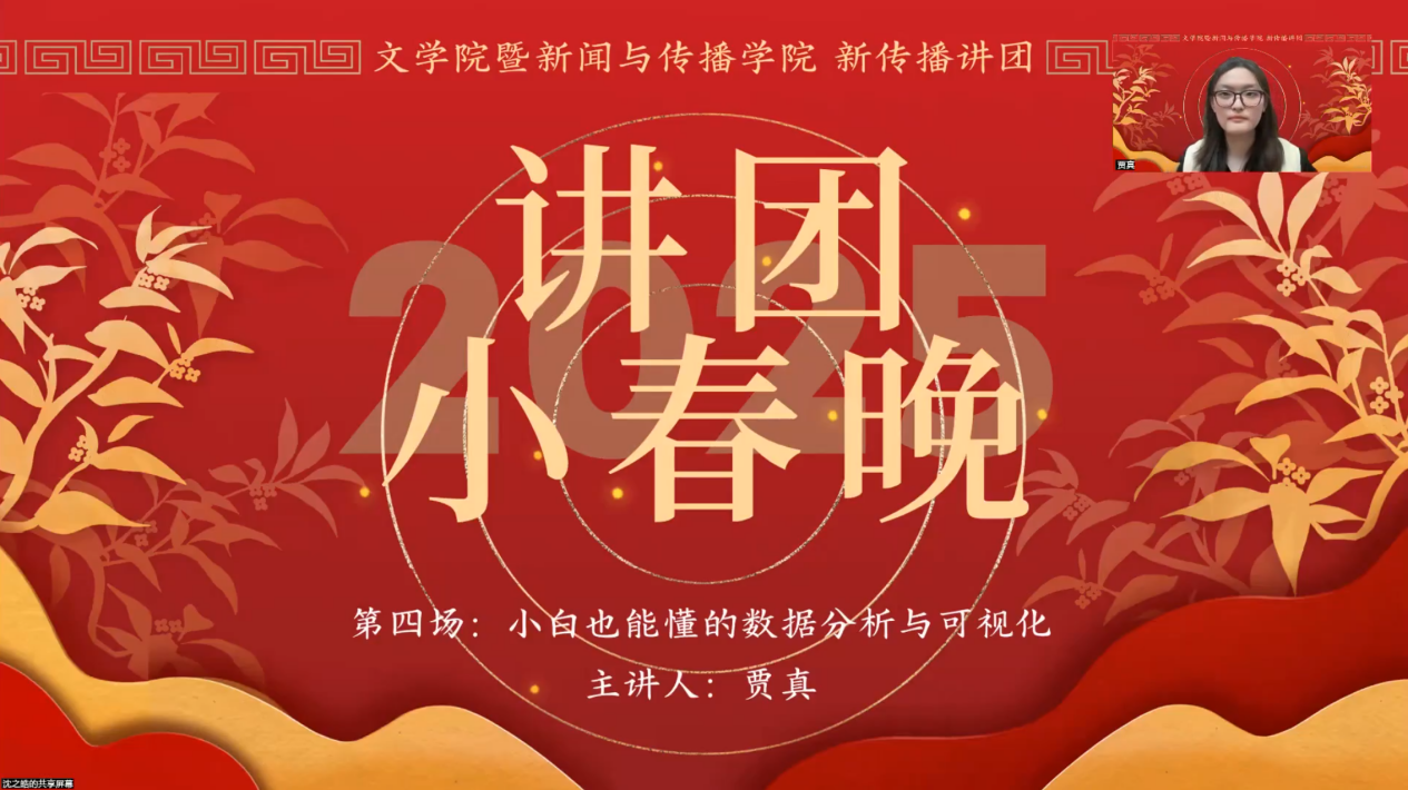 为丰富学生寒假生活,提升实践能力,1月20日至27日,球探网页版暨新闻与传播学院新传播讲团创新推出“讲团小春晚”线上培训活动。本次活动以腾讯会议为平台,面向学院各年级学生开展八场专题课程,内容涵盖秀米排版、会议摄影、新闻报道、数据分析等实用技能,吸引近五百人次参与,为文传学子搭建了寒假充电的“云端课堂”。