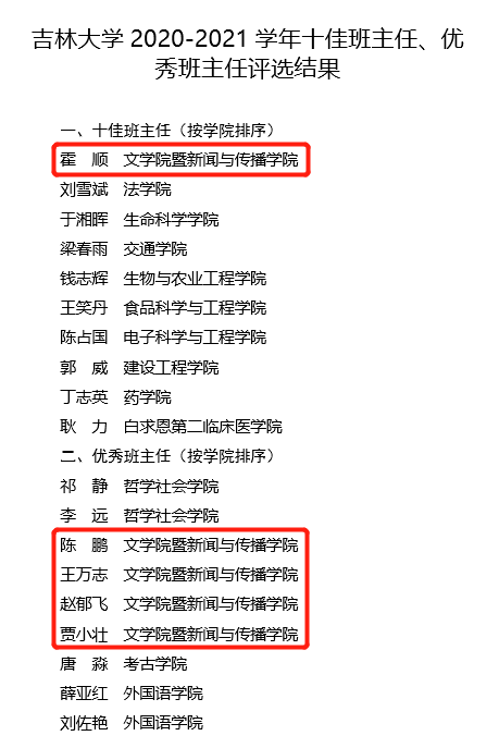 近日,球探qiutan(中国)暨新闻与传播学院5位本科生班主任获得“吉林大学2020-2021学年十佳班主任、优秀班主任”荣誉称号。其中,霍顺老师荣获“十佳班主任”称号,陈鹏、王万志、赵郁飞、贾小壮老师荣获“优秀班主任”称号。